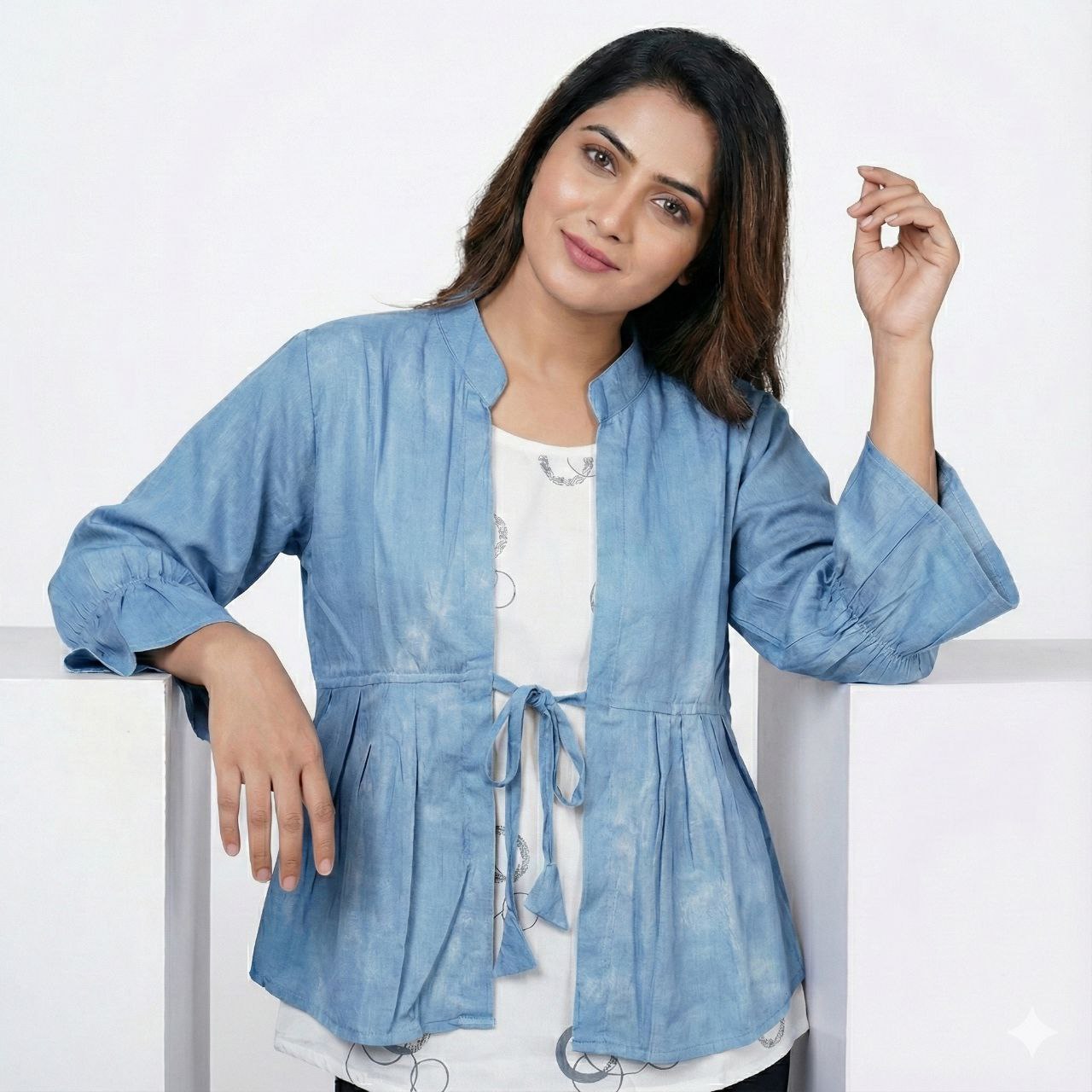 Elevate your everyday wardrobe with our Mandarin Collar Tie-Front Jacket. This versatile piece features a flattering peplum silhouette and trendy 3/4 bell sleeves with pleated detailing, making it the perfect layering piece for any season.